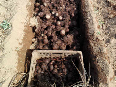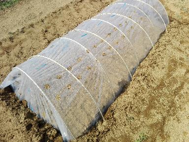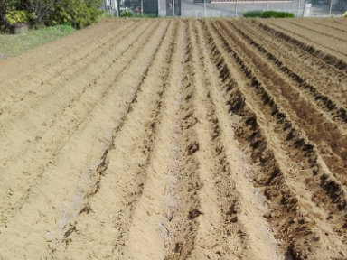 畝に鶏ふん堆肥を散布してから土をかけて均します。