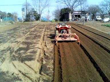 畑に堆肥と石灰を散布してからトラクターで耕します。