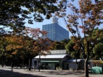 泊まり勤務を終えて帰り際に色づき始めた木々の間から放送センターが見えました。